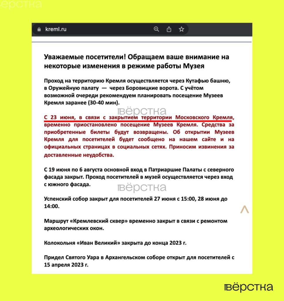 Фактически посетителей не пускали на территорию Кремля еще в среду, 21 июня, рассказал «Вёрстке» сотрудник одной из служб, работающих в Кремле. Ограничение допуска 21 и 22 июня могло быть связано с подготовкой к мероприятиям в честь Дня памяти и скорби — однако в пятницу, 23 июня, штатный режим работы так и не вернули. В частности, сотрудников музеев Кремля освободили от работы 24 и 25 июня, хотя суббота и воскресенье — это дни недели, когда Кремль посещает максимальное количество туристов.