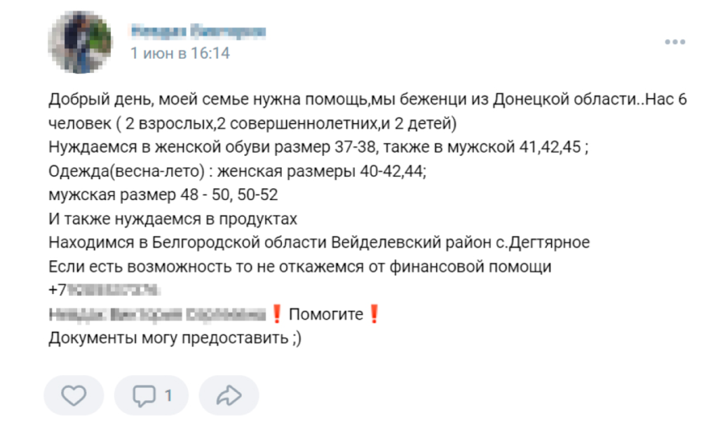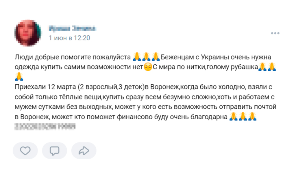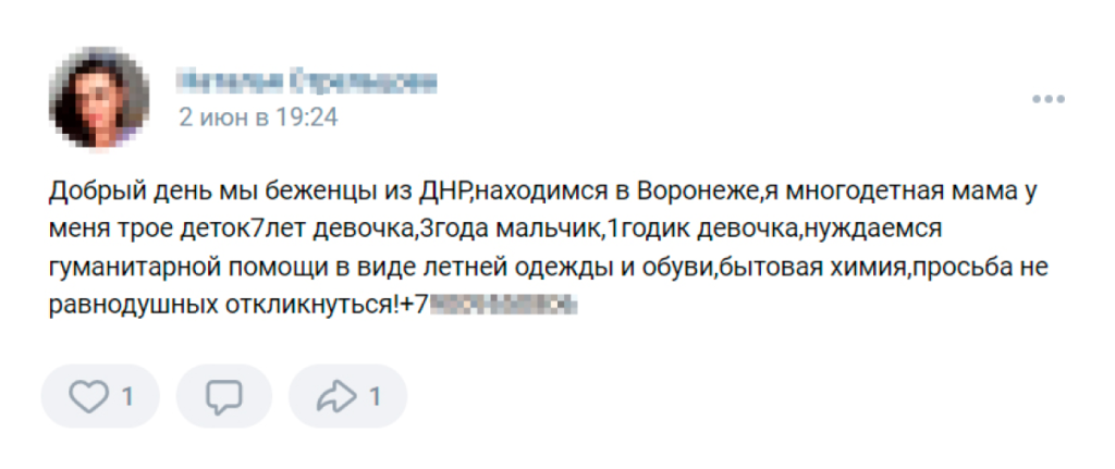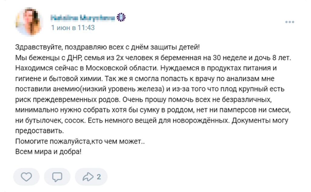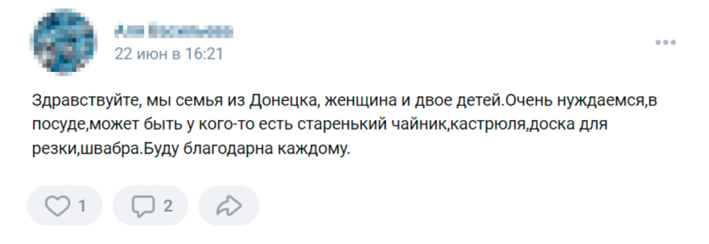 Жительница так называемой ДНР, которая приехала в Россию с сыном и дочерью, в своём посте рассказывает, что они «остались без ничего, лишились крыши над головой». Она просит помочь ей продуктами, детской одеждой и памперсами «для дочурки». Другая женщина — из Горловки — пишет, что ей нужна обувь для ребёнка, посуда, бытовая химия и лекарства. Женщина с двумя детьми из Донецка «очень нуждается» в «стареньком чайнике», кастрюле, доске для резки и швабре. Ещё одна мама из ДНР просит подгузники и стерилизатор для бутылок и обещает показать документы, подтверждающие, что она не мошенница.