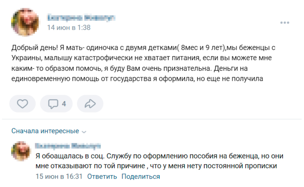 В российских сообществах помощи беженцам в соцсетях появляется много постов, опубликованных женщинами с детьми, прибывшими из Украины. Они пишут, что нуждаются в жилье, детских вещах, продуктах, мебели, бытовой технике, лекарствах, книгах для школьников. Многие посты начинаются словами: «Помогите, пожалуйста, чем можете».