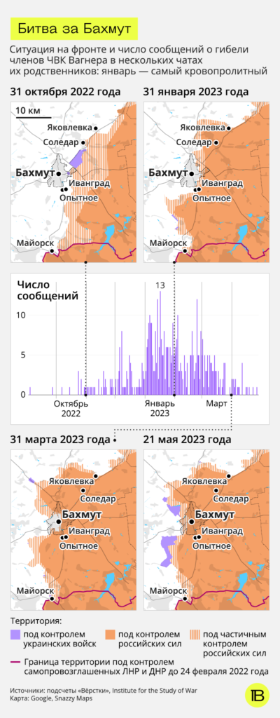 В последние числа месяца ЧВК Вагнера вновь активизировала наступление в попытках окружить город с юга и востока. Анализ «Вёрстки» также подтверждает, что в эти даты был зафиксирован рост смертности членов ЧВК.