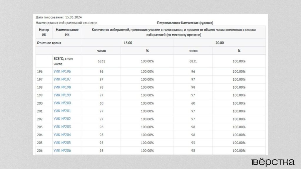В первый день выборов президента более чем на 400 избирательных участках на Дальнем Востоке явка составила 100% избирателей, следует из данных избиркомов Приморья, Камчатки, Чукотки, Магаданской области и Сахалина, которые проанализировала «Вёрстка».