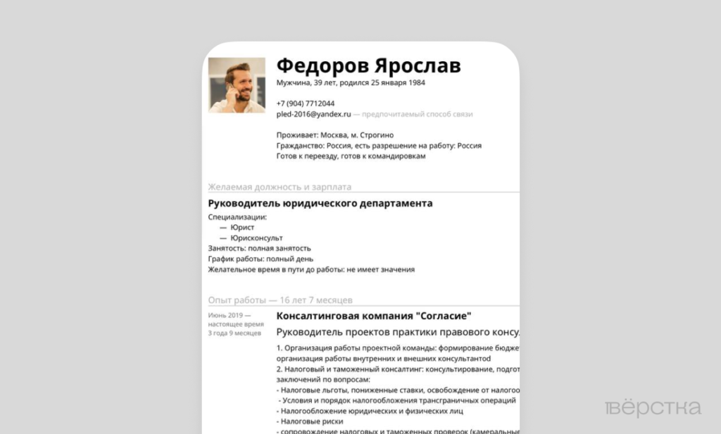 Опыт работы Ярослава я скопировала из своего настоящего резюме, на год уменьшив продолжительность работы в каждой компании — ведь Ярослав моложе меня.