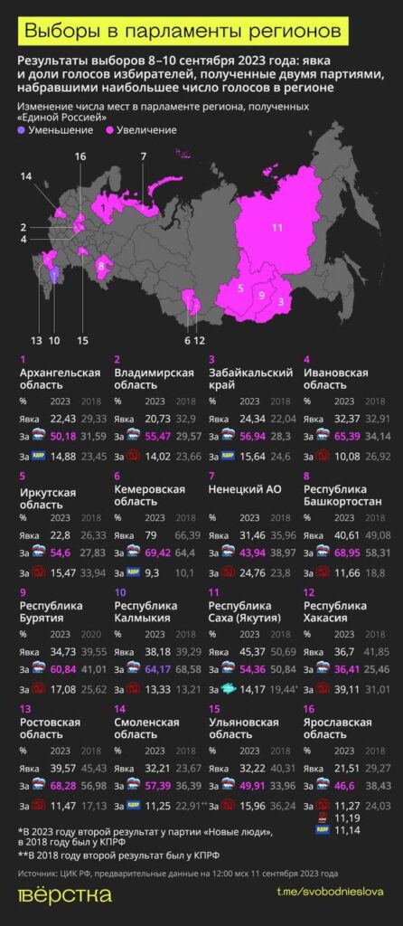 КПРФ заметно ухудшила результаты по итогам выборов 8–10 сентября в региональные парламенты, следует из результатов голосования, опубликованных в системе ГАС «Выборы». В большинстве регионов партия потеряла от трети до половины голосов по сравнению с выборами пятилетней давности. А в Якутии второе место вместо коммунистов заняли «Новые люди». Единственным местом, где коммунисты сохранили позиции стала Хакасия, где партия, как и в 2018 году, выиграла выборы главы и парламента.