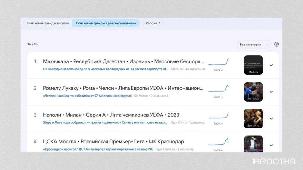 Тема протестов в аэропорту Махачкалы вышла в топ поисковых запросов согласно данным сервиса Google Trends, на которые обратила внимание «Вёрстка»
