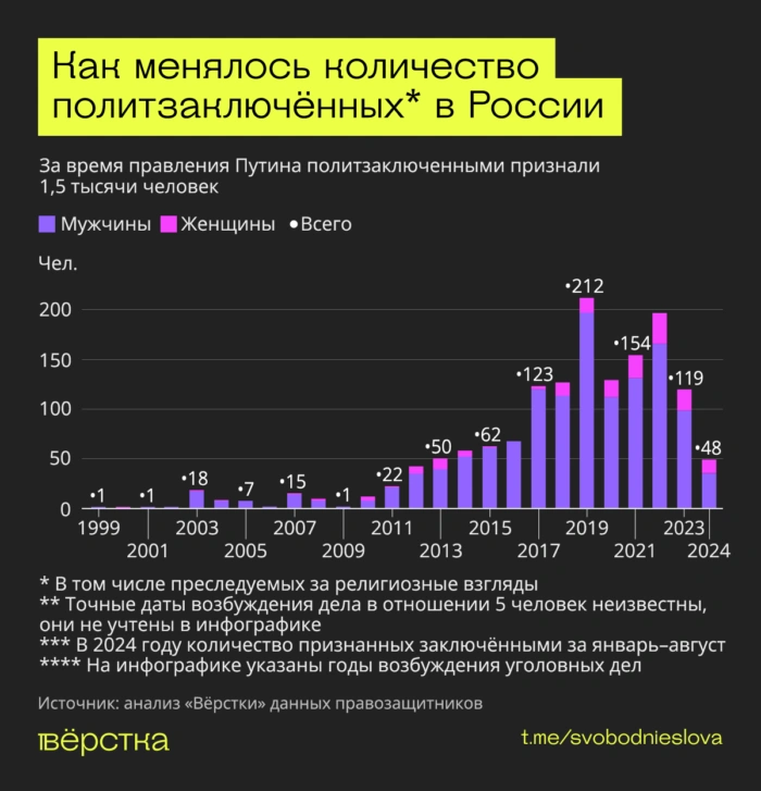 Российские правозащитники признали политзаключёнными около 1,5 тысяч человек, осуждённых с 1999 по 2024 годы. Некоторым россиянам, которых российские власти арестовывали по нескольким уголовным делам в разные годы, этот статус присваивался дважды.