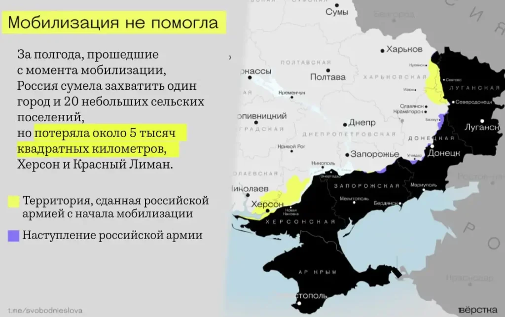 Украине удалось освободить Херсон и ещё несколько крупных городов, в том числе Лиман. Всего за шесть месяцев ВСУ заняли несколько сотен населенных пунктов.