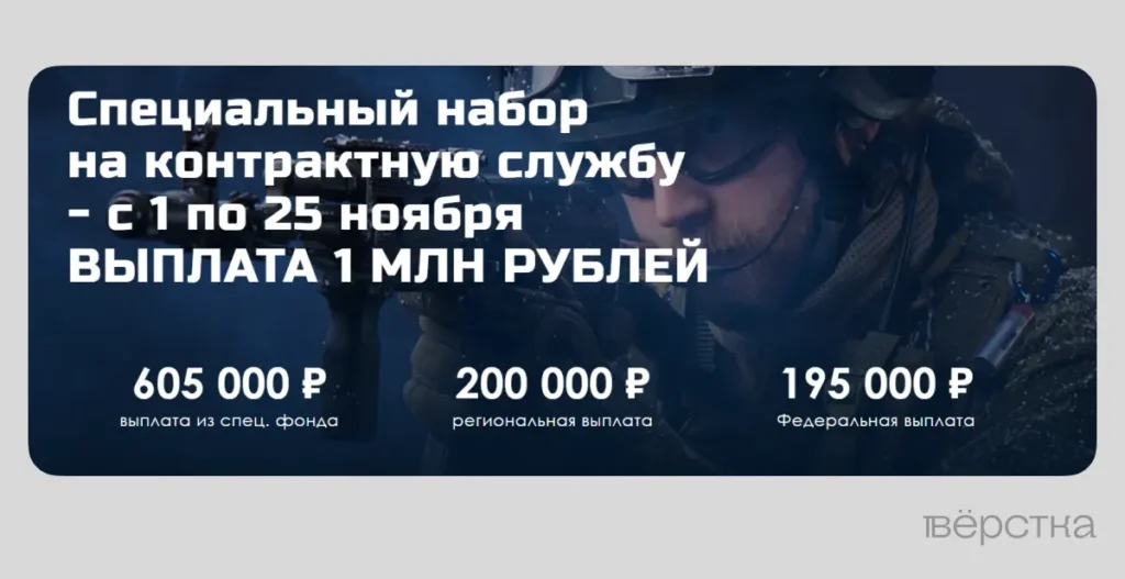Выросла и единоразовая сумма, которую Правительство Московской области обещает добавить к федеральной выплате. На старте кампании в апрелеi контрактники получали 600 тысяч рублей, включая региональную надбавку в 405 тысяч. 3 ноября информация на сайте обновилась: разовая выплата выросла с 600 тысяч до 1 миллиона рублей. Уже 6 ноября была запущена первая рекламная кампания в «Яндексе» — вероятно, результаты набора контрактников к началу ноября не устраивали Правительство Московской области.