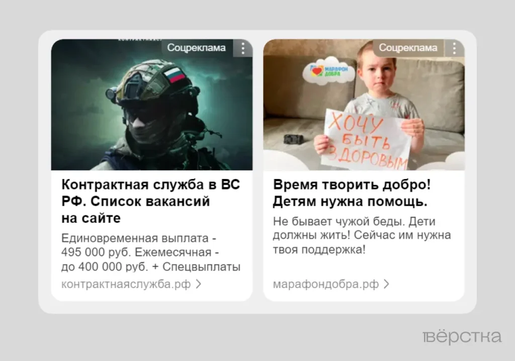 Заместитель генерального директора ИРИ Андрей Воронков рассказал, что социальную рекламу с «госповесткой» готовят профессиональные агентства. По его словам, CTR таких кампаний на 77% выше, чем у НКО, которые делают рекламу самостоятельно. Рекламные креативы для продвижения службы по контракту действительно выглядят качественно. Маркетологи, с которыми поговорила «Вёрстка», сошлись на разумной нижней границе CTR равной 0.1% — в 5 раз ниже стандартного значения.