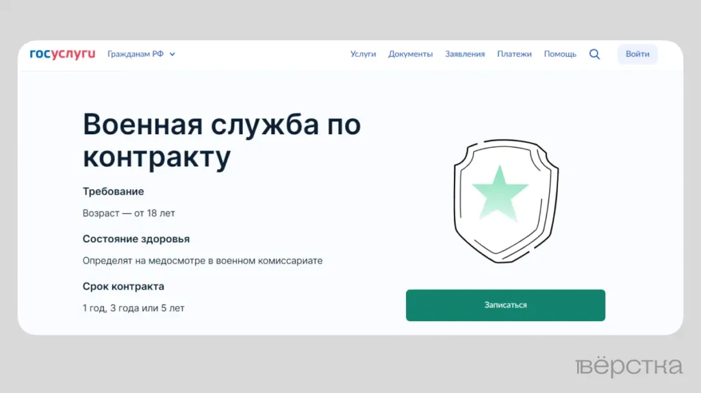 Каждое объявление, размещённое Минцифры, ведёт на один из двух сайтов: напрямую на Госуслуги или на поддомен ИРИi. Государственная услуга, продвижением которой занимается Минцифры, — это «Военная служба по контракту». Пользователям, которые кликнули на «социальную рекламу» от ведомства, на оформленной в стилистике Госуслуг странице предлагают подписать контракт с Минобороны.