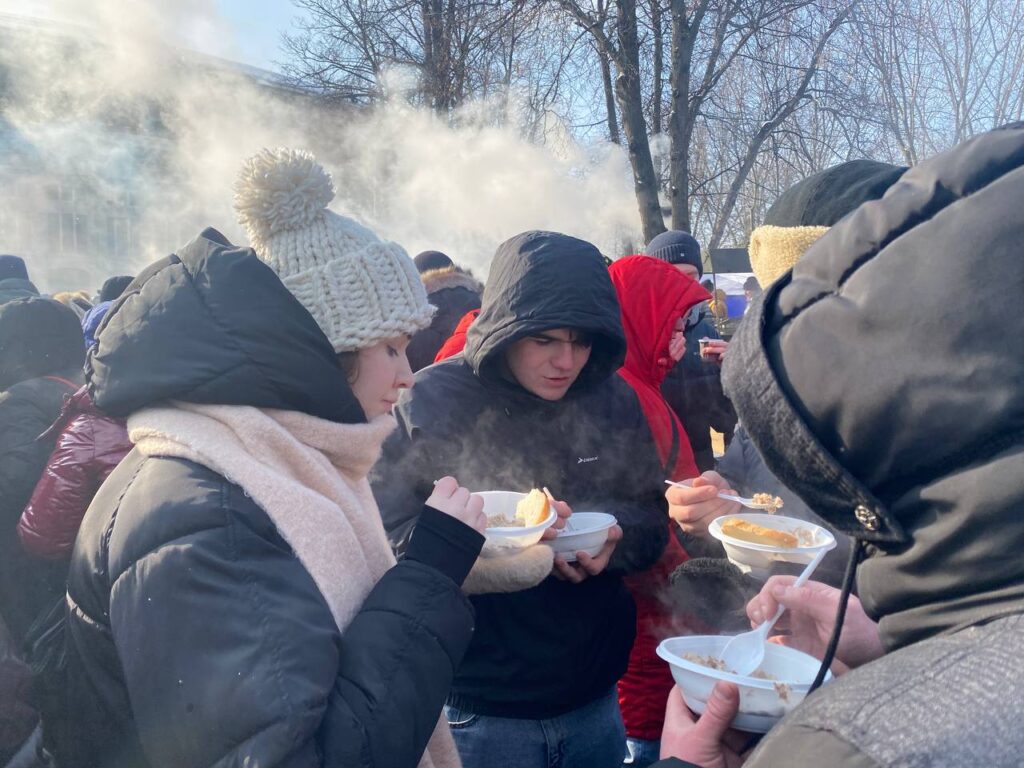 Кругом валит пар — на полевой кухне готовится «солдатская каша», то есть гречка с тушенкой. Тарелки раздают желающим. Ещё можно взять чай и «горячие сосиски» — по сути хот доги. Я беру кашу: она немного пересолена, но на морозе кажется очень вкусной.
