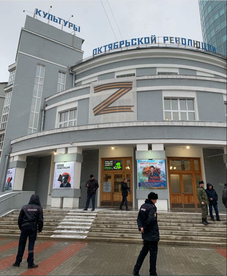 Утром 19 ноября в Новосибирске на улице плюсовая температура, в центре города, на площади Ленина, дежурят автомобили ДПС. На одноимённой улице из колонок театра кукол звучит песня Бременских музыкантов: «Нам дворцов заманчивые своды не заменят никогда свободы». ДК Октябрьской Революции находится в ста метрах, здание украшает огромный баннер в виде буквы Z.