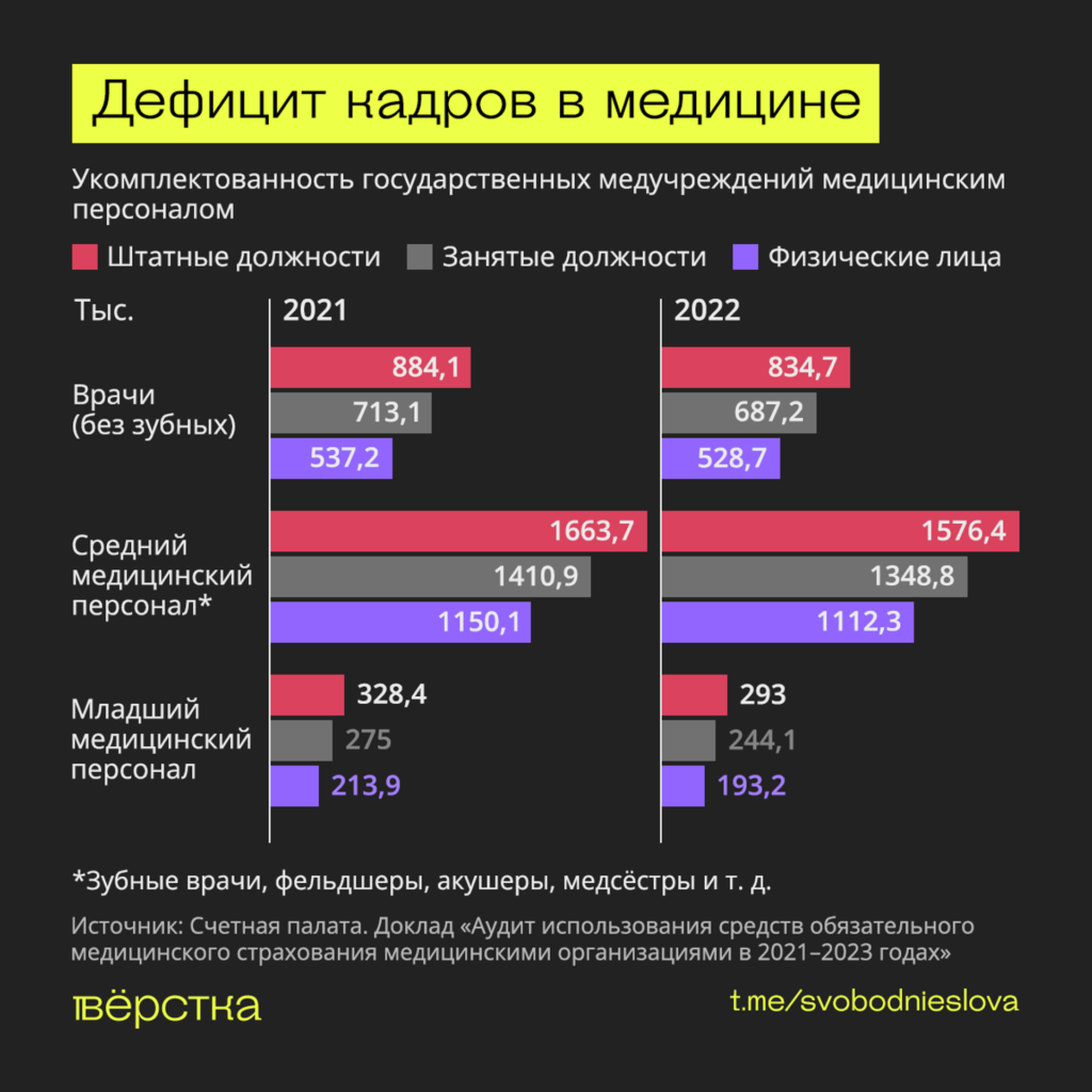 В последнем отчёте Счетной палаты приведены данные, что в 2022 году общих штатных ставок для врачей в госучреждениях (без учёта стоматологов) насчитывалось 834,7 тыс., при этом врачей (физических лиц) в системе работало только 528 тыс. человек. Только часть ставок (687 тыс.) были закрыты благодаря совместительству (то есть один врач работает более, чем на одну ставку), остальные же — пустовали.