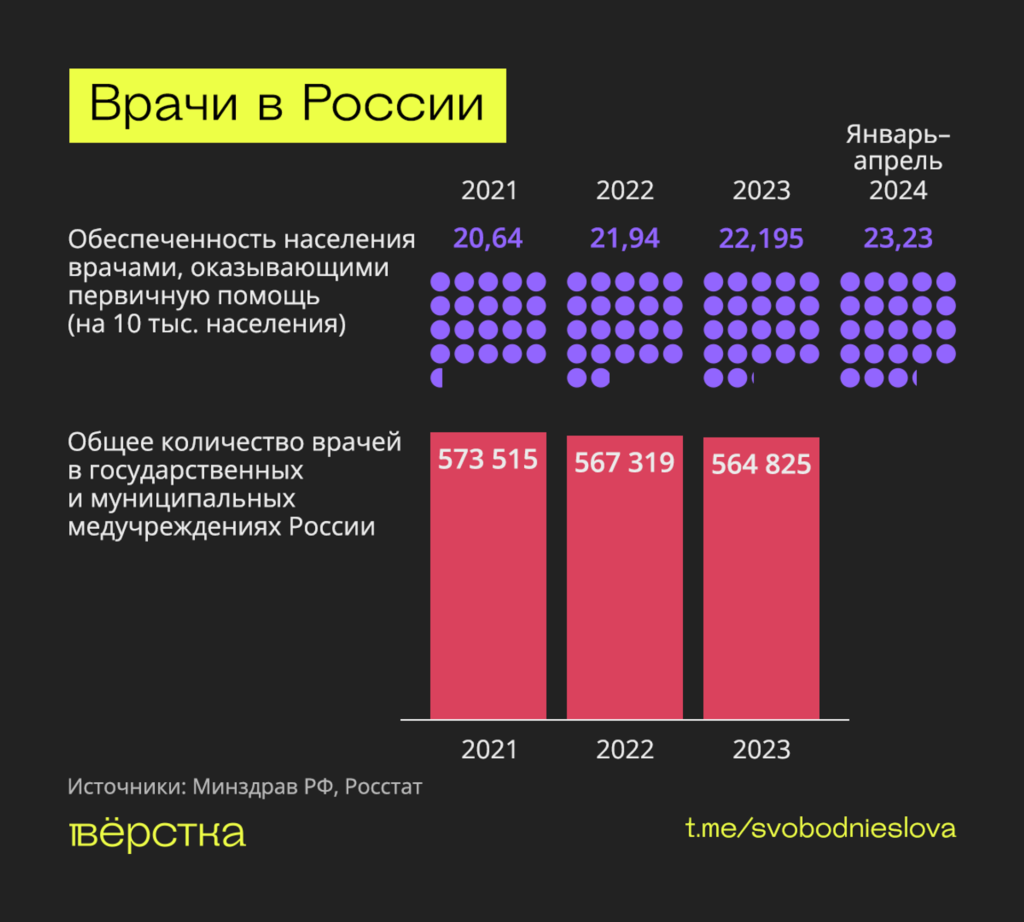 При этом дефицит кадров в России признаётся даже официальной статистикой. В 2023 году в государственных медучреждениях работали 549 тыс. врачей — хотя за год в системе здравоохранения прибавилось 10,8 тыс. специалистов (пришло 94,7 тыс. врачей, ушло — 83,8 тыс.), общий кадровый дефицит оценивался в 29,4 тыс. врачей, подсчитывали в Минздраве.