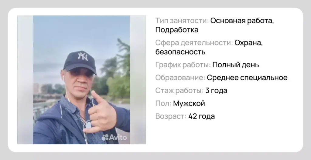 Наверное, самым «известным» соискателем на позицию охранника на сайте «Авито» можно назвать 45-летнего Станислава Нестеренко из Санкт-Петербурга. Пять лет назад о Нестеренко писали многие федеральные СМИ: Российская газета, КП, Регнум. Санкт-Петербургский горсуд в 2018 году за вооружённый разбой по ст. 162 ч.4 п. в. УК РФ и убийство по ст. 105 УК РФ приговорил его к 21 году колонии особого режима. Нестеренко вместе с собутыльником в 2016 году решили ограбить женщину, но она оказала сопротивление, и Нестеренко её зарезал. Добычей грабителей стали 450 рублей. Эту судимость он получил практически после освобождения из колонии — в 2008 году Нестеренко уже был судим по ч. 4 ст. 111 УК за умышленное причинение тяжкого вреда здоровью, повлекшее по неосторожности смерть потерпевшего.