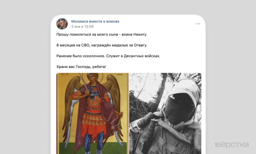 «Прошу помолиться за моего сына, воина Никиту. 8 месяцев на СВО. Награждён медалью за отвагу. Ранение было осколочное», — пишет мать десантника.