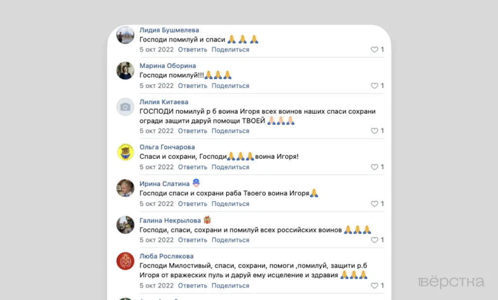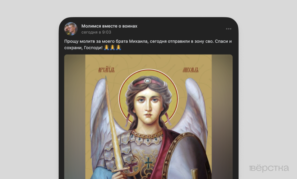 «Молимся вместе о воинах» — так называется сообщество, которое появилось во «ВКонтакте» после объявления мобилизации. В нём родственники выкладывают фотографии военных и вместе молятся за них. Сегодня группа насчитывает 26 тысяч участников. Она превратилась в своеобразный виртуальный храм с онлайн-молебнами и собственными традициями, а стена паблика напоминает иконостас. «Вёрстка» изучила сотни постов в этом сообществе, посетила онлайн-молебны и панихиды и познакомилась со священником-куратором группы, чтобы понять, во что верят и о чём просят Бога россияне, чьи сыновья, мужья, братья и отцы воюют в Украине.