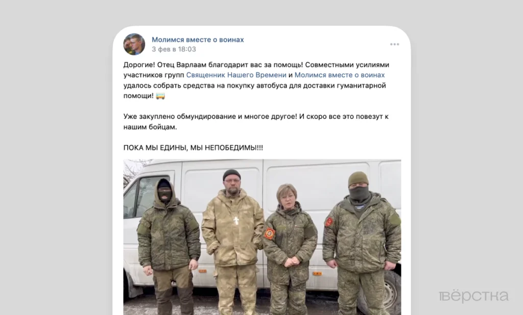 Например, 3 февраля администраторы группы объявили, что совместными усилиями подписчики сообществ «Молимся вместе о воинах» и «Священник нашего времени» собрали деньги на автобус, который будет доставлять военным на передовую гуманитарную помощь.