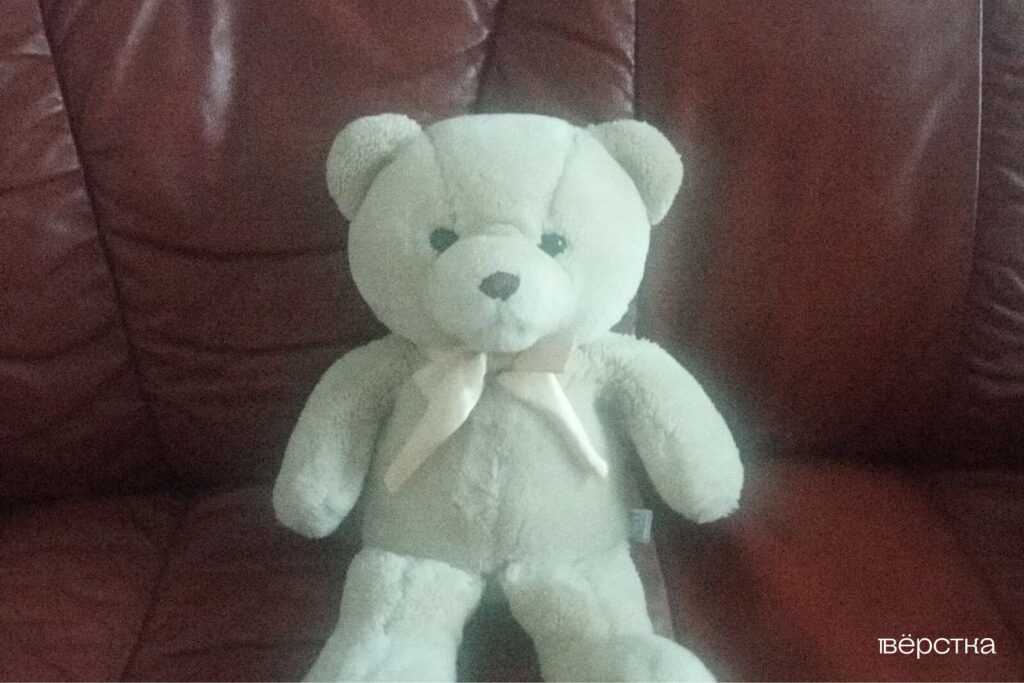 Бывший муж забрал из квартиры белого медведя сына и передал нам. Медведь был грязным, чёрным, весь в саже. Мы его стирали-стирали — и он пожелтел. Так что теперь у моего сына жёлтый медведь, как когда-то был у меня.