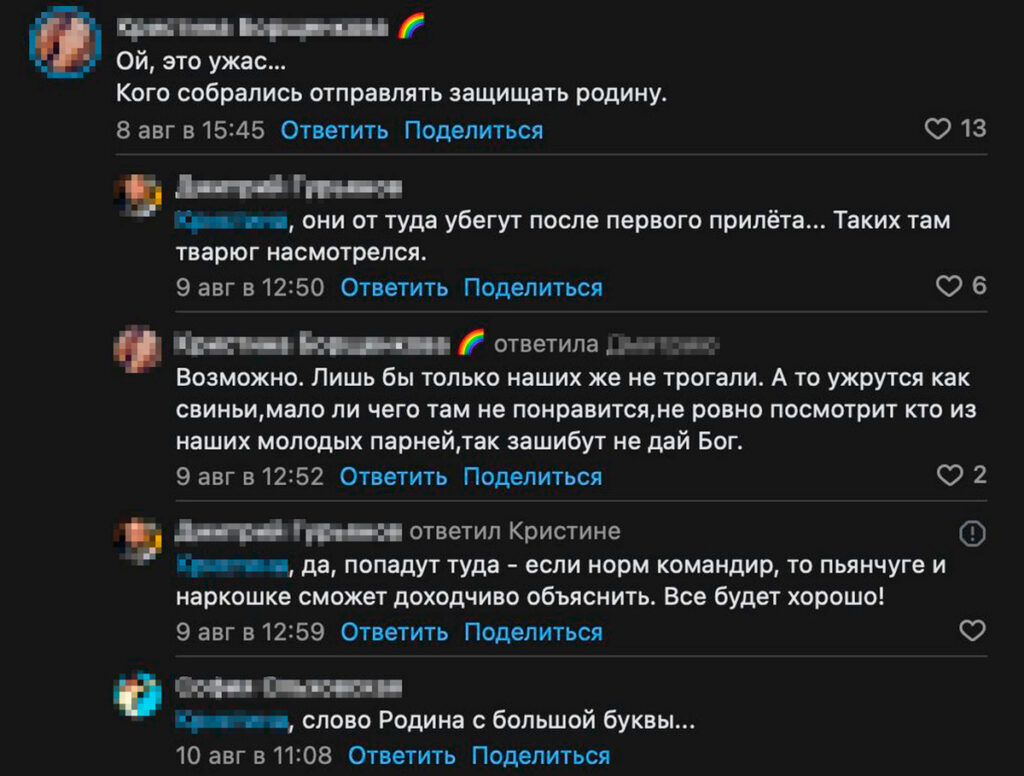 «Эти люди будут защищать страну? — говорит она. — Люди, которых набрали по объявлению? Они с самого утра и каждый божий день пьют и валяются под окнами! Их не учат ничему. Им дадут столовый нож в руки и отправят на мясо вперёд танков и остальных. Что это? Распределение народа? <…> Плачевная ситуация не только в нашем посёлке, но и в стране».
