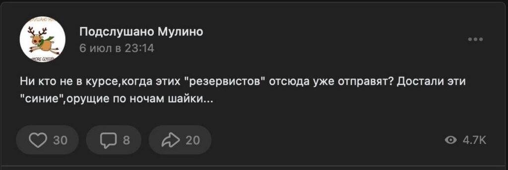 В августе в местных группах во «ВКонтакте» стали появляться жалобы на поведение военных, прибывших за последнее время. В нескольких постах жители Мулино требуют, чтобы добровольцы вернули им украденные сумки и документы. Одна из таких публикаций набрала 11 тысяч просмотров и сотни комментариев. В ней говорится: «Добровольцы! Верните рюкзак с паспортом, телефоном! Камеры зафиксировали вас».