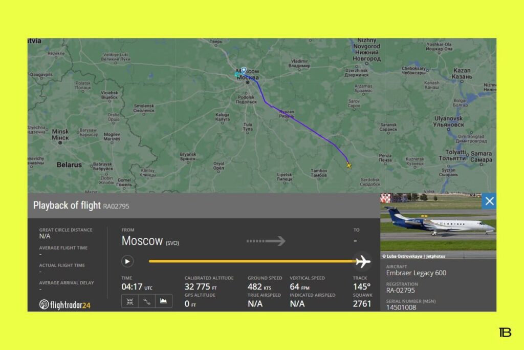 Согласно данным Flightradar, самолёт главы ЧВК вылетел из московского аэропорта Шереметьево в 6:37 (мск) и направился на юг. Сигнал борта пропал над посёлком Башмаково в Пензенской области. Спустя чуть больше часа сигнал вновь появился на 10 минут над Кумылженским районом Волгоградской области в сервисе Flightaware. В это время, судя по траектории полёта, бизнес-джет поворачивал в сторону города Миллерово в Ростовской области, где расположен военный аэродром — ближайший к прифронтовым территориям.