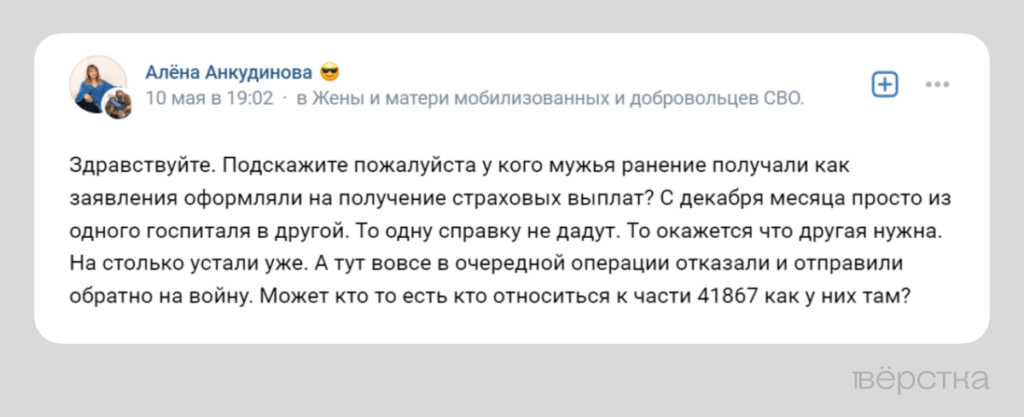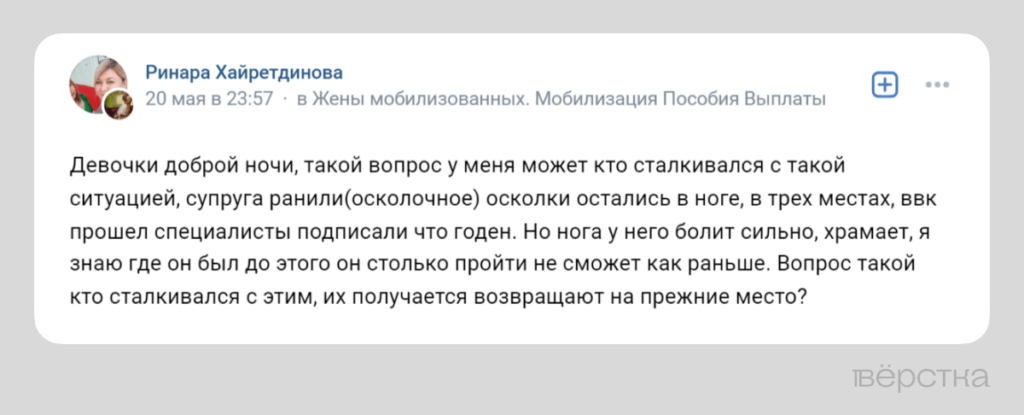 Надежда Румянцева, просившая совета в группе «Жёны и матери мобилизованных и добровольцев СВО» на странице «ВКонтакте», рассказала «Вёрстке», что её супруг получил на фронте контузию. По её словам, мужчина лечился в госпитале почти три недели, ему выдали справку о военной травме. «У него образовался гипертонический криз, ухудшилось зрение, слух. Но ему не дали отпуска для реабилитации и не назначили ВВК», — утверждает она. Надежда говорит, что обратилась в военную прокуратуру, но пока не получила ответ.