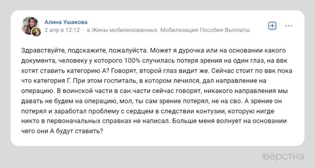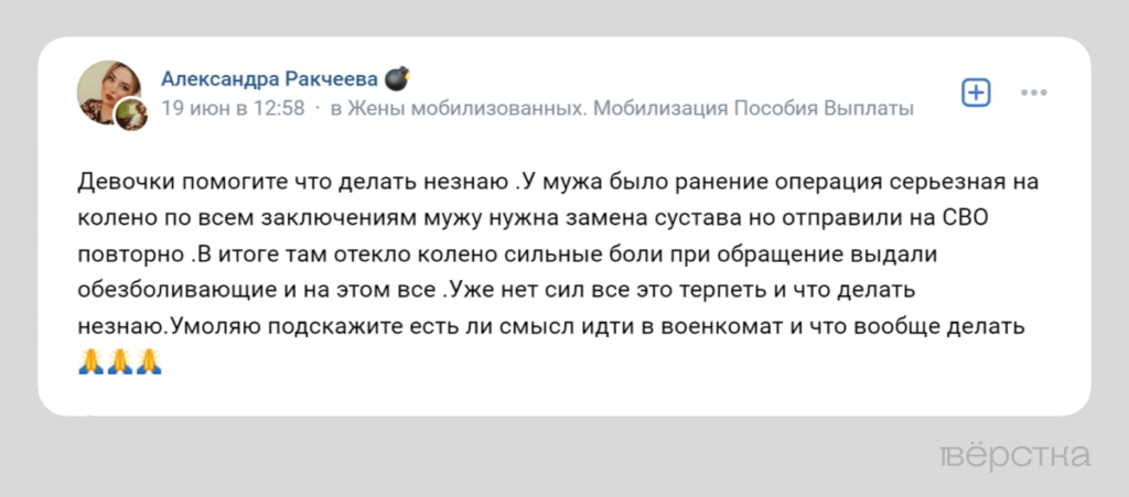 В тематических пабликах и чатах, в которых общаются жёны контрактников и мобилизованных, несогласие с заключением военно-врачебных комиссий — одна из основных тем для обсуждения. Женщины спрашивают друг у друга совета: что делать, если мужа после серьёзной травмы отправляют обратно на фронт? Многие жалуются, что после госпиталя военнослужащему не проводили военно-врачебную комиссию и не определяли его годность к дальнейшей службе.