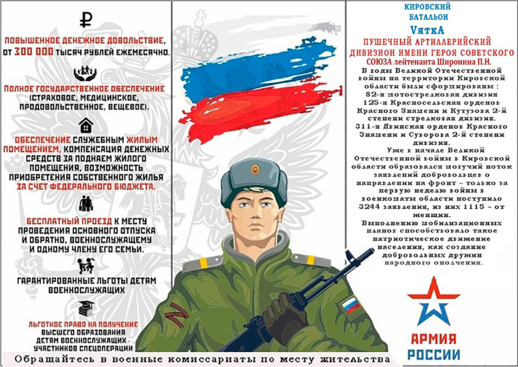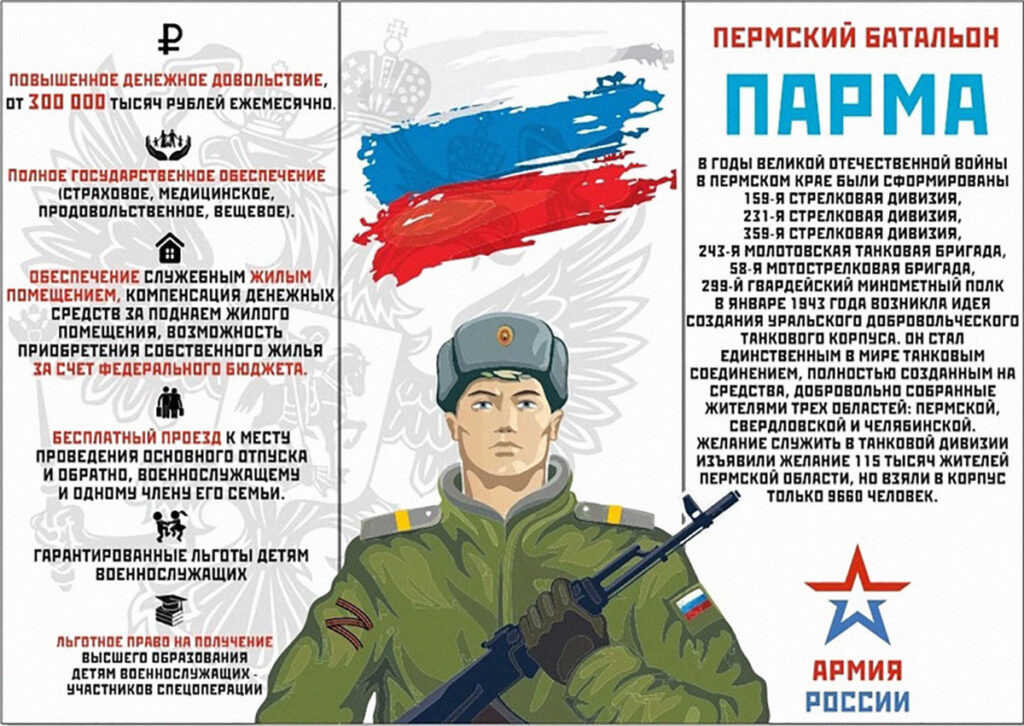 В Перми и Кирове предлагают доход «от 300 тысяч рублей ежемесячно». В Башкортостане — минимум 280 тысяч рублей, из которых 220 тысяч рублей платит Министерство обороны и две тысячи в сутки — республика. Дополнительно башкирским добровольцам обещают платить по восемь тысяч рублей за каждый день боевых действий (не указано, кто именно будет выплачивать эту сумму. — Прим. ред.).
