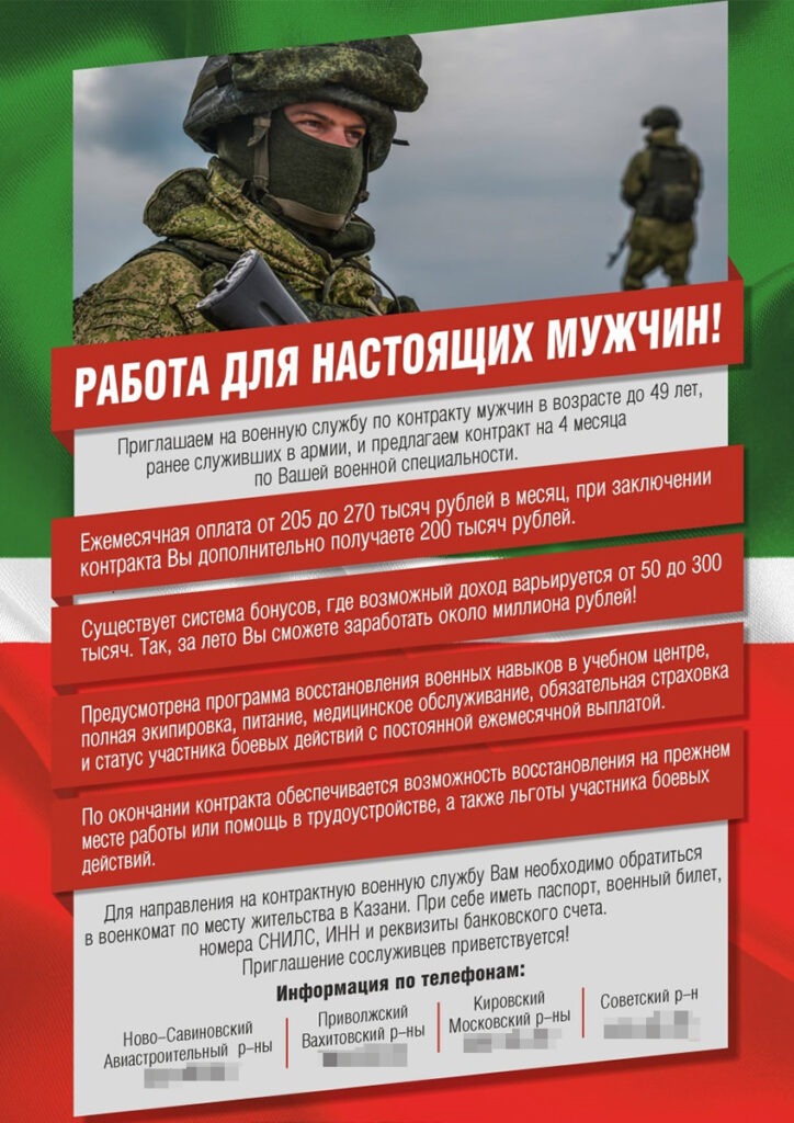 Участникам татарстанских батальонов предлагают от 205 до 270 тысяч рублей в месяц, а также премии. «Существует система бонусов, где возможный доход варьируется от 50 до 300 тысяч рублей. Так за лето вы легко сможете заработать около миллиона рублей!», — говорится в объявлении, которое распространяется в татарстанских пабликах и СМИ.