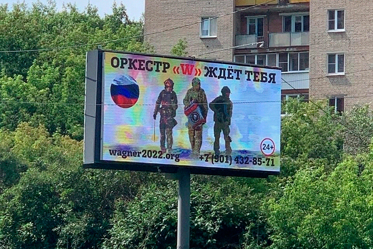 ЧВК Вагнера стала активно искать новобранцев ещё в начале боевых действий в Украине. В первые месяцы объявления публиковались в соцсетях и закрытых чатах. Теперь призывы вступать в ряды наёмников появляются и на городских билбордах.