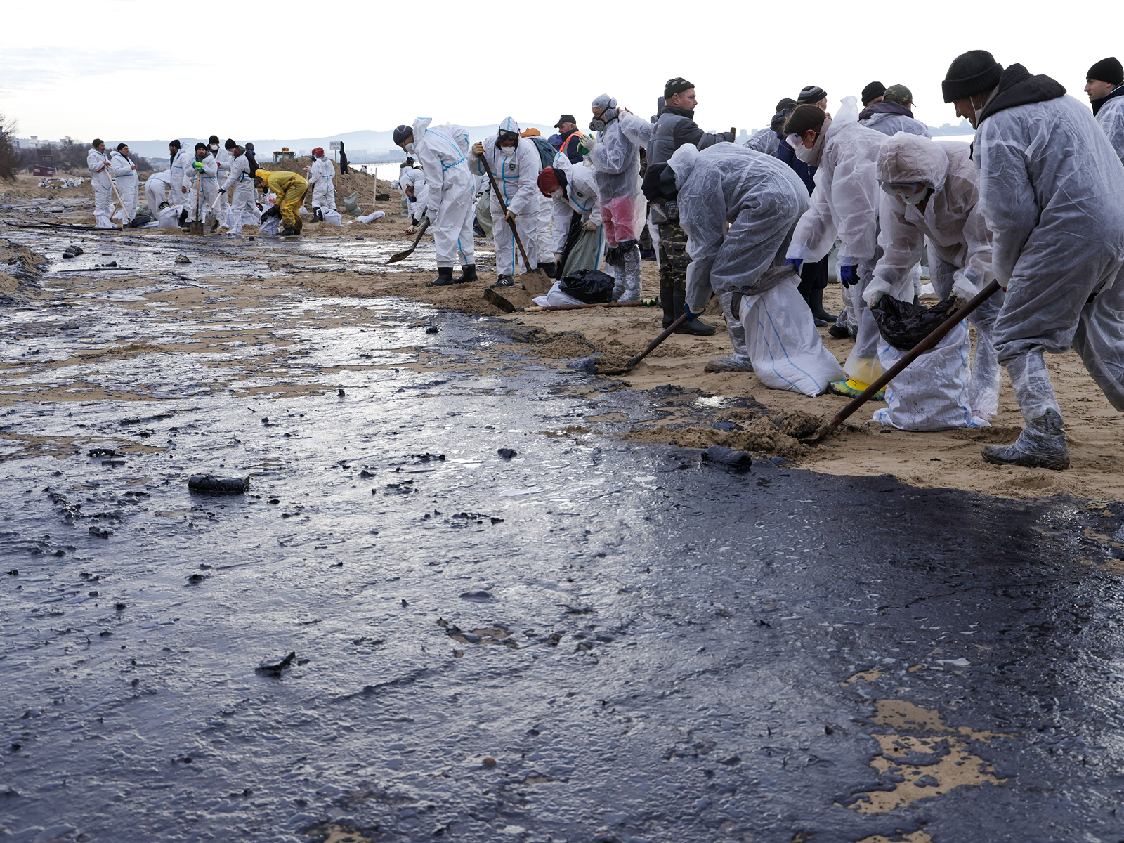 Фото: Волонтёры убирают пропитанный нефтью пляжный песок недалеко от черноморского курортного города Анапа после крушения 15 декабря нефтяных танкеров, 25 декабря 2024 года. Фото: Dmitry Feoktistov/TASS/Profimedia