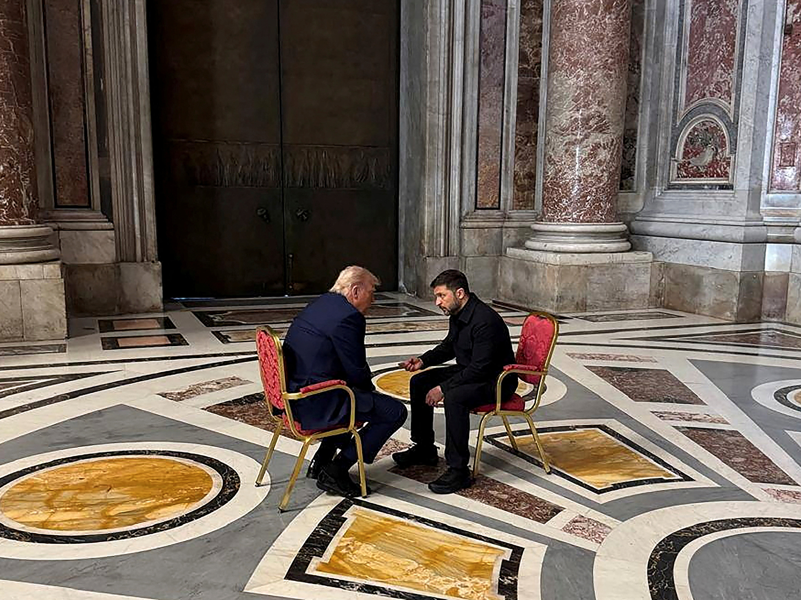 Фото: президент Украины Владимир Зеленский и президент США Дональд Трамп встретились во время похорон папы римского Франциска в Ватикане 26 апреля 2025 года. Ukrainian Presidential Press Service/Handout via REUTERS