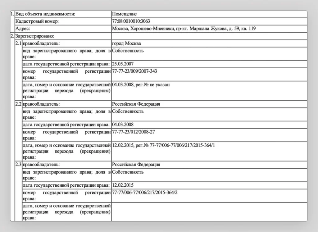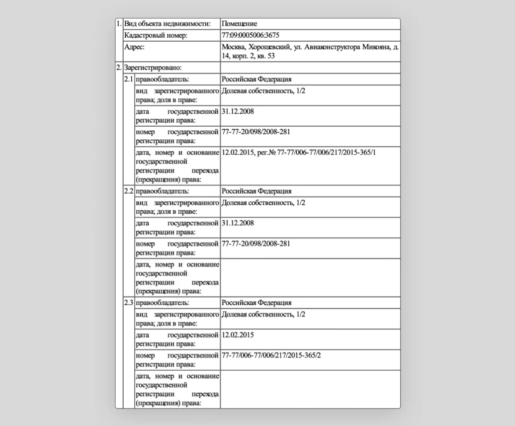 По данным Росреестра, 31 декабря 2008 года сразу две «Российских Федерации» оформили эту квартиру в долевую собственность. В 2015‑м одна из долей перешла к третьей «Российской Федерации».