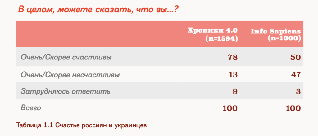 Один из вопросов, которые социологи задавали собеседникам, — счастливы ли они. В России 78% опрошенных сказали, что они счастливы. В Украине счастливыми себя считают только 50% человек, а 47% участников чувствуют себя скорее несчастными, чем счастливыми, или даже очень несчастливыми.