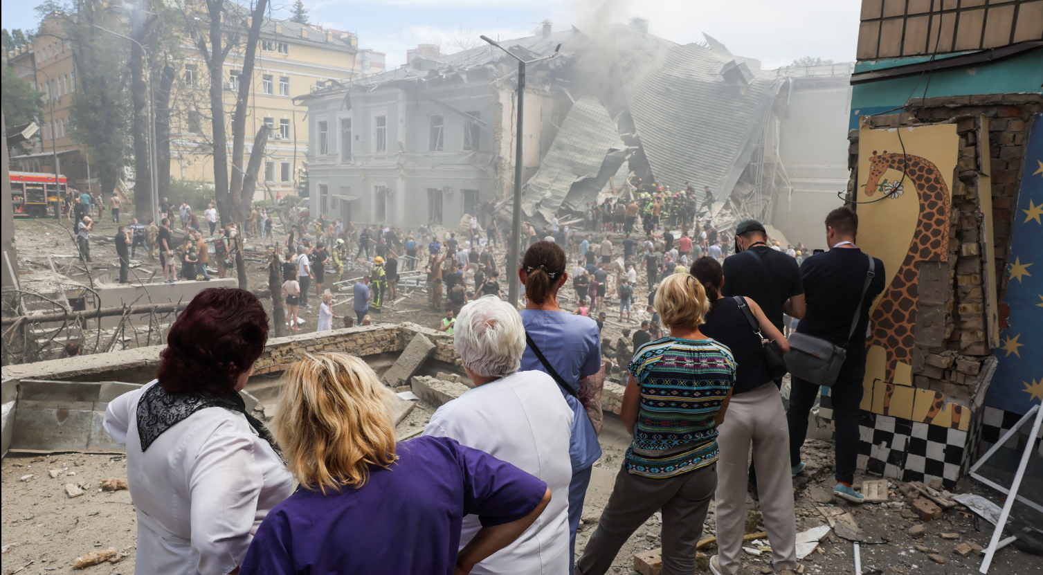 Во время атаки детей из больницы «Охматдет» эвакуировали вместе с капельницами, фото оттуда выложил Андрей Ермак. По словам главы Минздрава Украины Виктора Ляшко, основной удар пришёлся на корпус, где дети получали диализ – очистку крови, также повреждения получили реанимационные, операционные и онкологическое отделение.