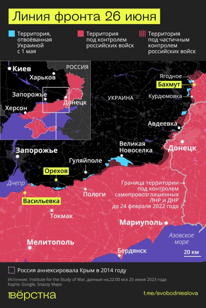ВCУ с 24 июня, когда Евгений Пригожин объявил о «походе» на Москву, начали наступление минимум по трём направлениям. На некоторых из них есть успехи.