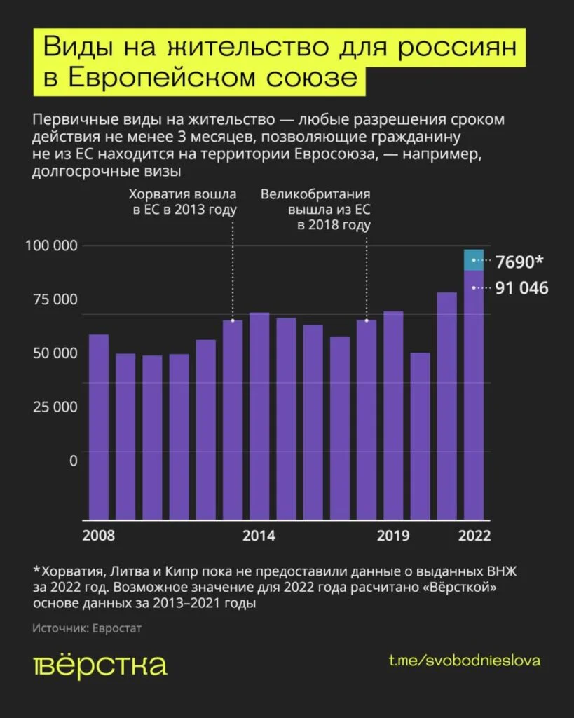Статистику по выданным видам на жительство пока что не предоставили Хорватия, Литва и Кипр. В предыдущие девять лет (этот отрезок взят, поскольку Хорватия вошла в Евросоюз в 2013 году) доля этих трёх государств в предоставленных россиянам ВНЖ составляла 5,9% от всех остальных стран ЕС. Таким образом, потенциальное число видов на жительство для граждан России от этих государств в 2022 году может быть на уровне 5,5 тысячи, а общее количество первичных ВНЖ от стран Евросоюза в году может достигать 99,6 тысячи.