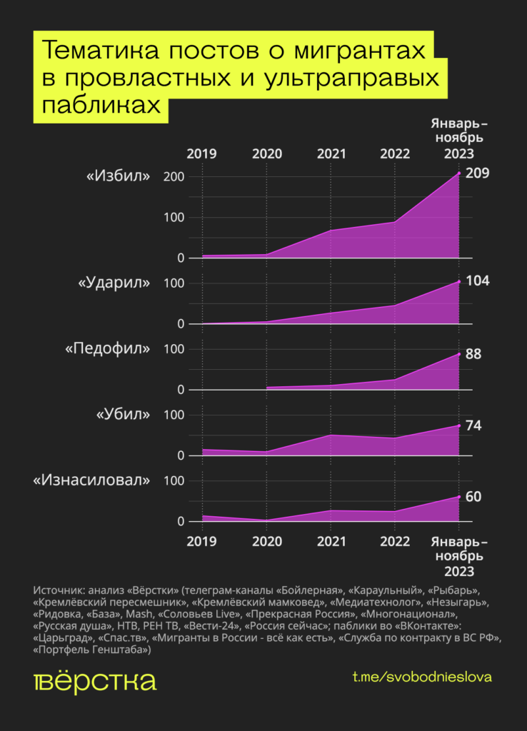 Часть из них, как выяснила «Вёрстка», посвящают теме мигрантов не более 2–3 постов в год, и 2023 год никак не изменил эту тенденцию. Другие, напротив, во втором полугодии 2023 года стали намного активнее, чем обычно, писать о мигрантах. Среди них — провластные и консервативные СМИ, некоторые региональные новостные паблики и ультраправые сообщества в Тelegram и «Вконтакте».