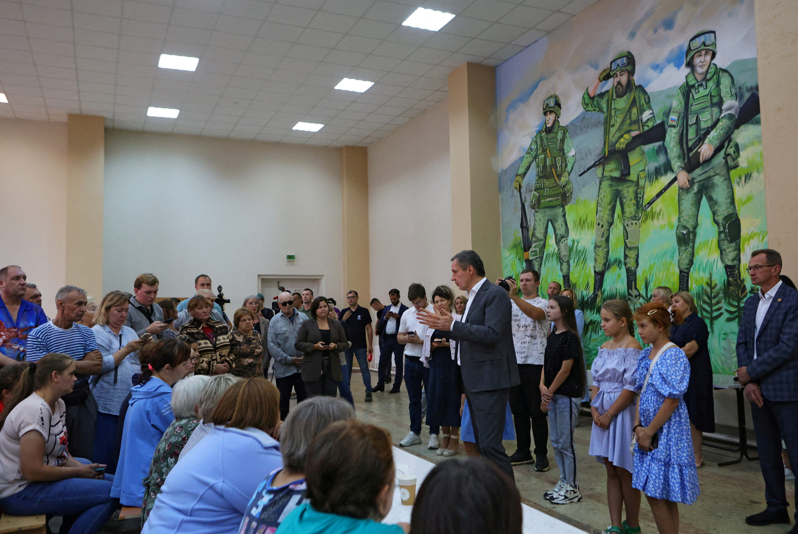 Фото: Губернатор Белгородской области Вячеслав Гладков общается с беженцами из приграничных районов Белгородской области, эвакуированными в Старый Оскол, 14 августа 2024 года. REUTERS/Stringer REFILE