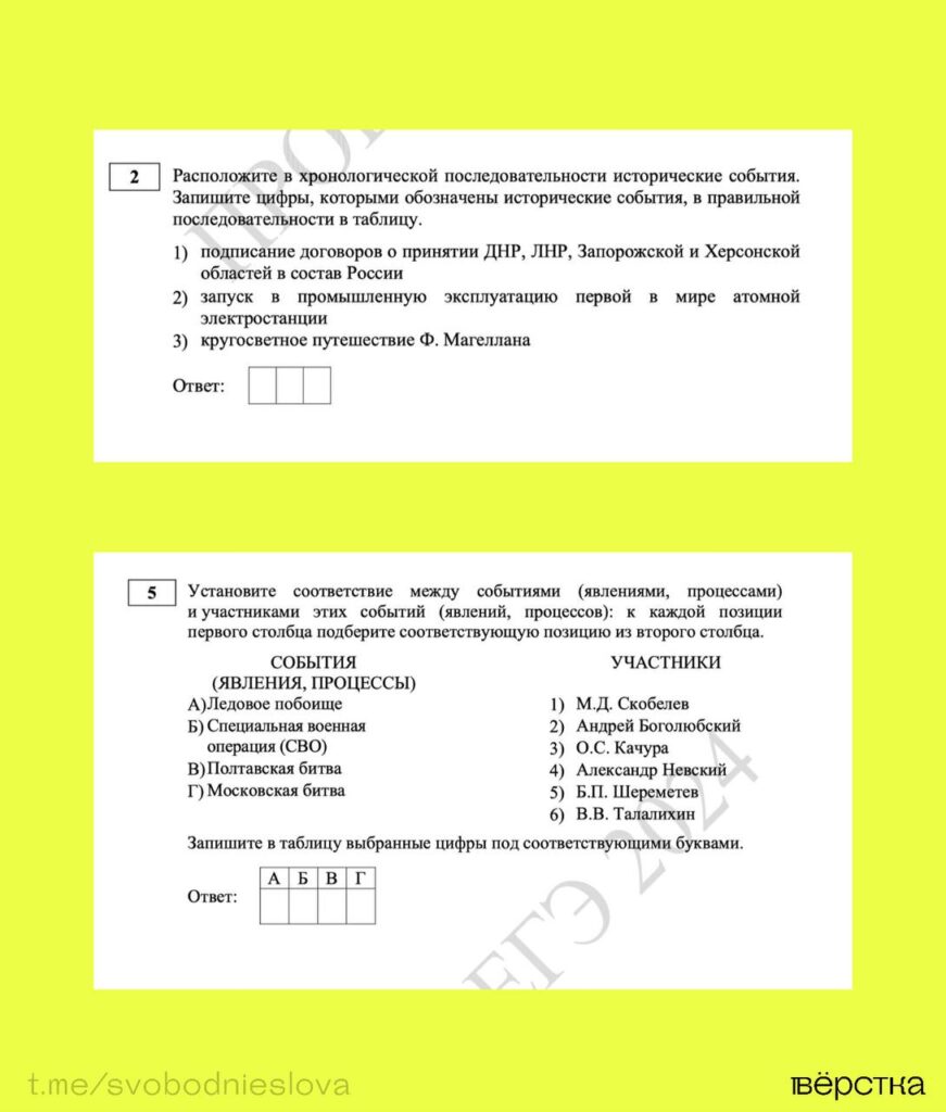 В одном из вопросов предлагают расположить в хронологическом порядке подписание «договоров о принятии ДНР, ЛНР, Запорожской и Херсонской областей в состав России», запуск первой в мире атомной электростанции и кругосветное путешествие Магеллана. В другом задании 11-классников просят соотнести Ледовое побоище, СВО, Полтавскую и Московскую битвы с участниками этих событий.