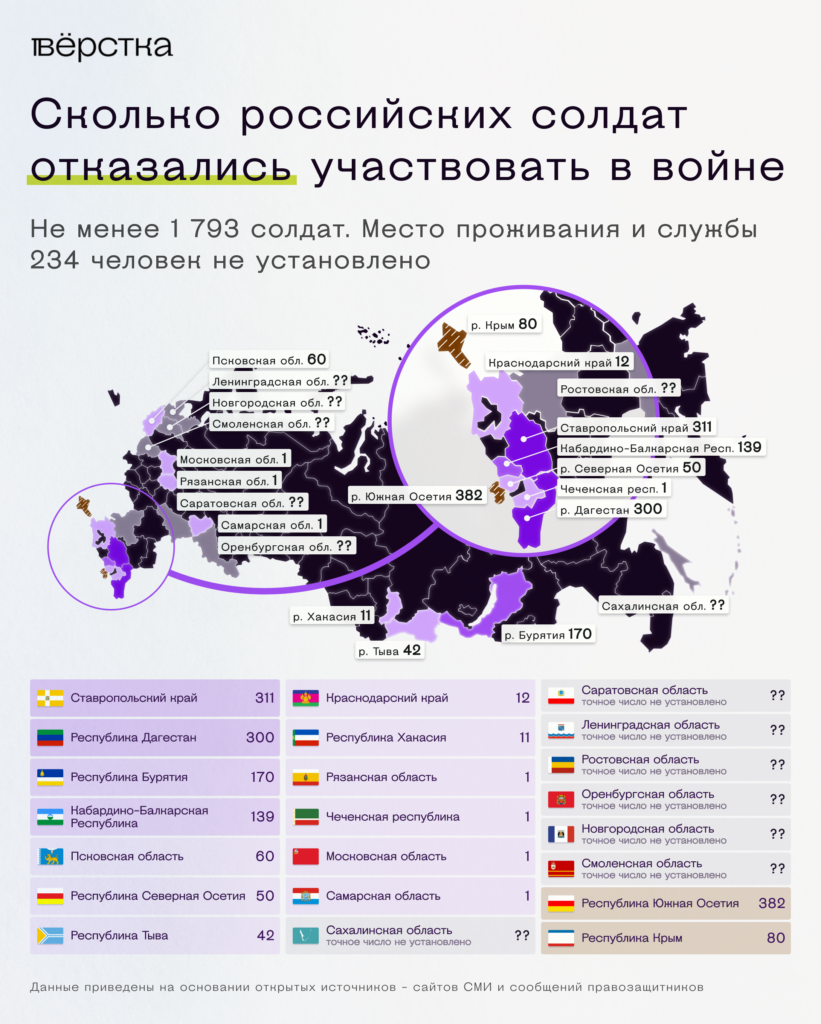 По данным российских правозащитных организаций и СМИ, с начала войны служащие из 22 регионов сообщили о том, что не хотят воевать. «Вёрстка» посчитала все случаи, о которых стало известно с конца февраля: по открытым данным, как минимум 1 793 россиянина заявили, что хотят сложить оружие (подробное описание расчётов — в последнем блоке материала. — Прим. ред.).