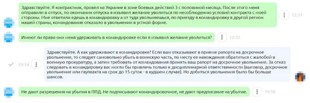 Мария Вьюшкова — эксперт фонда «Свободная Бурятия», который регулярно консультирует военнослужащих, желающих расторгнуть контракт. Она рассказывает, что часто люди, желающие отказаться от военной службы, также сталкиваются с угрозами со стороны командования. Например, им обещают отдать военный билет с записью «Склонен к измене, лжи и обману» и говорят, что с такой отметкой после увольнения они не смогут устроиться даже на гражданскую работу.