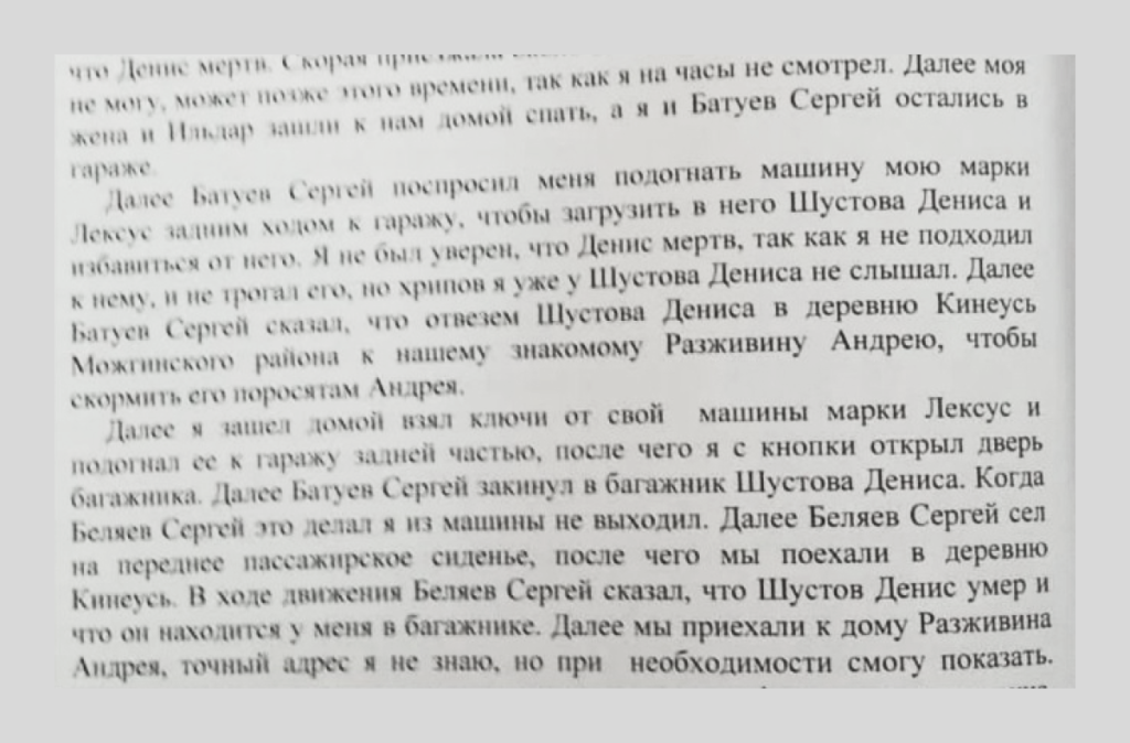 В первом пресс-релизе следователи действительно сообщали о соучастнике, который помогал Батуеву прятать в лесу тело Шустова. В материалах дела соучастник рассказывает, как по просьбе Батуева подогнал к гаражу свой «Лексус», в который положили тело. Убийца на машине Исаева планировал вывезти тело в деревню к их общему знакомому и «скормить его поросятам».