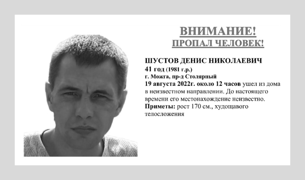 «19 августа 2022 года около 12 часов ушёл из дома в неизвестном направлении. До настоящего времени его местонахождение неизвестно», — говорилось в сообщении. Спустя чуть больше недели, 1 сентября, поисковики написали, что Денис Шустов погиб.