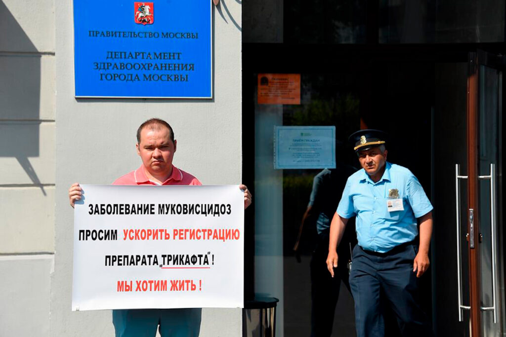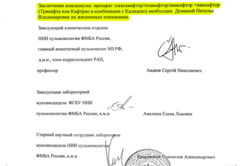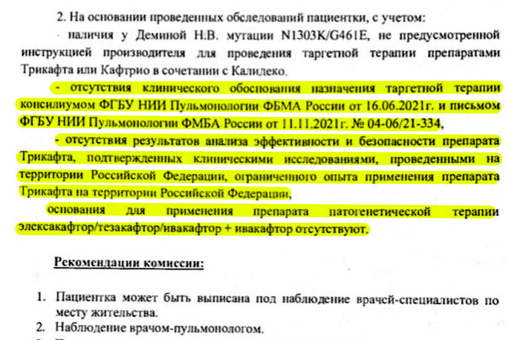 Препарат не зарегистрирован в РФ, но закон позволяет проводить индивидуальные закупки. Наталье лекарство не согласовали: Департамент здравоохранения Москвы заявил, что конкретно её мутация не прописана в инструкции к «Трикафте», несмотря на то, что у неё есть заключение о том, что препарат ей подходит. Кроме того, лекарство одобрено для 90 % пациентов: заболевание имеет тысячи мутаций, которые невозможно прописать в инструкциях.