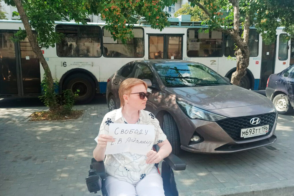 Рядом с первой пикетчицей появляется женщина в инвалидной коляске — это Наталья Туркеева, у неё СМА. Она тоже вышла на пикет, чтобы поддержать Ройзмана. К ней подходят полицейские и настаивают, чтобы она отъехала подальше, иначе её задержат за «несанкционированное массовое мероприятие», так как она находится слишком близко к девушке с плакатом.