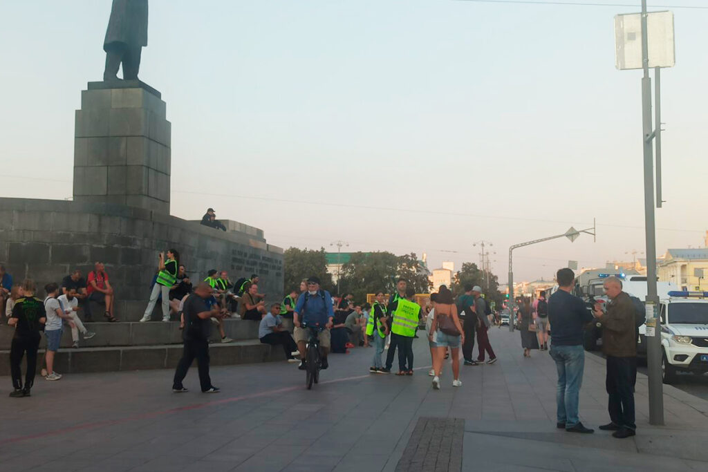В центре площади образуется стихийный молчаливый протест. Десятки людей мрачно садятся на ступеньки у памятника Ленину. Сергей, сотрудник Школы Астрономии, говорит, что приехал сюда на велосипеде.
