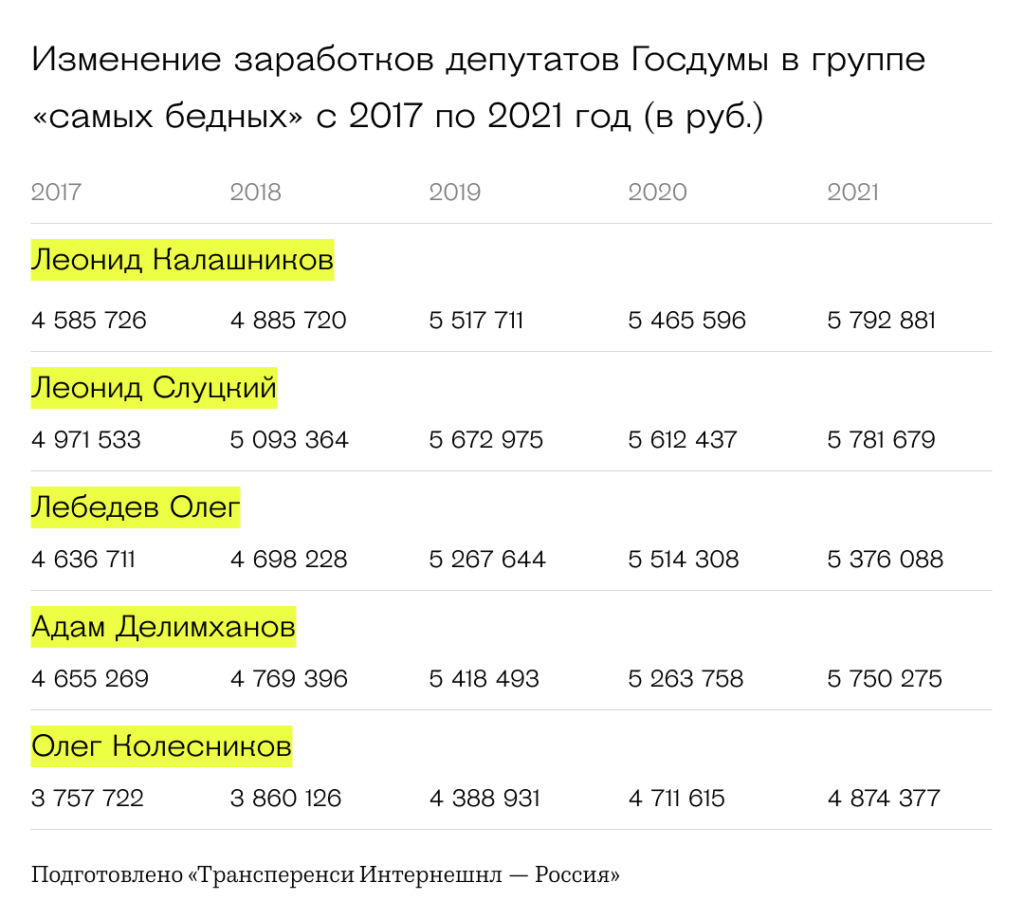 Как видно из этой таблицы, заработки депутатов, официально не имеющих дополнительных источников доходов, за последние четыре года выросли в среднем на 15–30 %. Так, рост доходов Олега Колесникова составил 30 %, Леонида Калашникова — 26 %, Адама Делимханова — 24 %, Олега Лебедева и Леонида Слуцкого — 16 %.