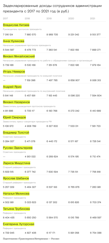 По составленной «Трансперенси» таблице видно, как менялись заработки кремлёвских чиновников разного уровня с 2017 года. Для примера были отобраны чиновники АП с более-менее стабильными доходами (то есть без резких повышений или снижений за этот период).
