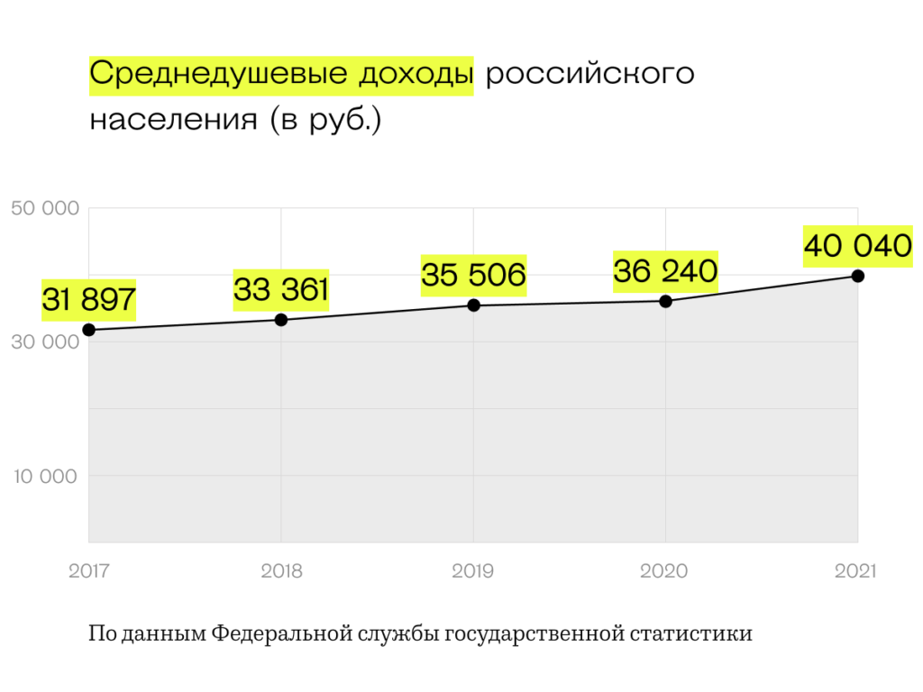 Ещё меньше, по подсчётам Росстата, изменились среднедушевые доходы российского населения: за четыре года они увеличились на 26 %.